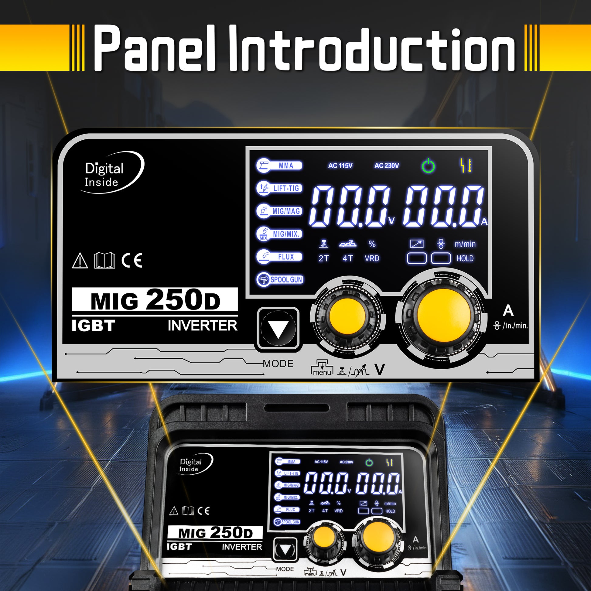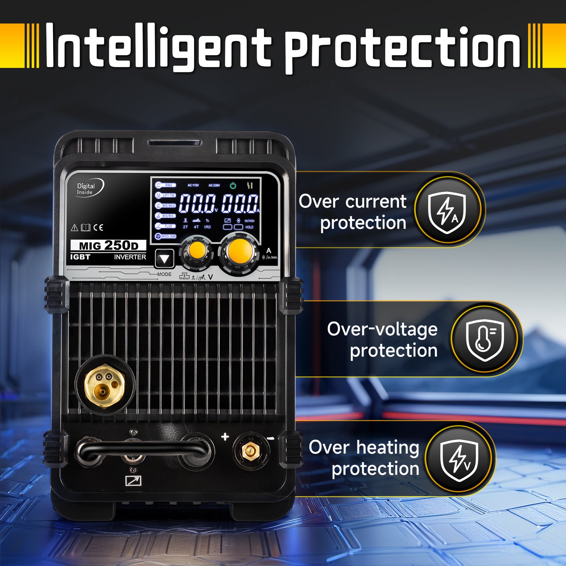 安全機能と携帯性:過電流、過熱、過電圧保護機能を搭載したMIG250Aは、安全な溶接を保証します。ハンドルとショルダーストラップを備えたポータブル設計で、屋内でも屋外でも簡単に持ち運びできます。